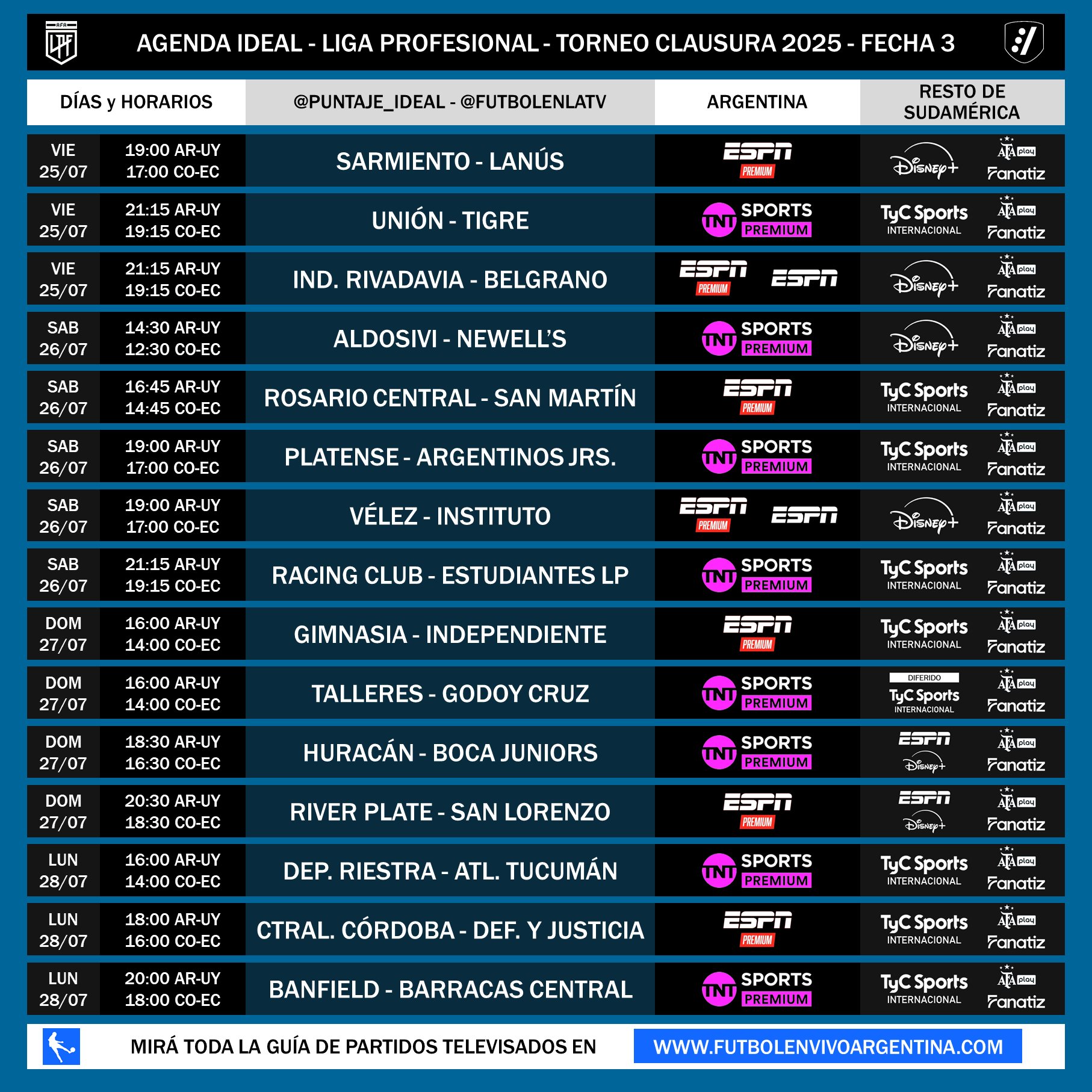 El sábado sigue la Fecha 3 del Torneo Clausura 2025 con el duelo entre Rosario Central y San Martín de San Juan, por ESPN Premium, desde las 16.45hs. Más tarde, al mismo tiempo que Vélez ante Instituto, juegan Platense y Argentinos Juniors por TNT Sports Premium.
