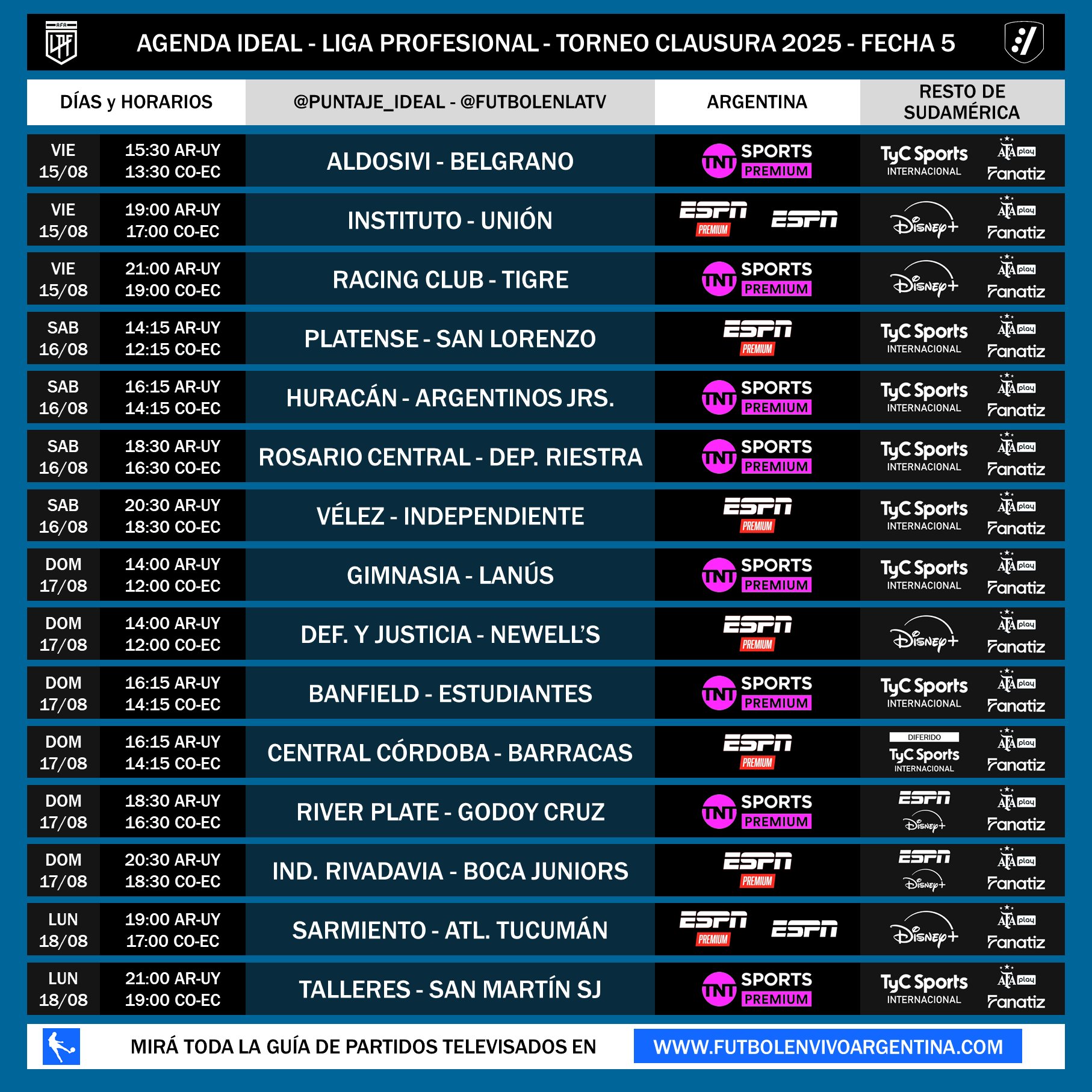 River recibe a Godoy Cruz desde las 18.30hs, por la pantalla de TNT Sports Premium. Mientras que Independiente Rivadavia es local de Boca en Mendoza, desde las 20.30hs, por ESPN Premium. El lunes, la fecha 5 cierra con Sarmiento vs. Atlético Tucumán. Desde las 19hs. Y a las 21hs, Talleres es local de San Martín de San Juan, con transmisión de TNT Sports Premium.